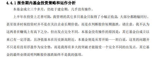 一直以来,徐彦在定期报告里的“小作文”是他的个人一大特色。在大成兴远启航的二季报和半年报里,徐彦的表述则令人深思:“本基金没有操作的原因是:其他基金自成立以来已有一定浮盈,且净值基本在历史新高附近,本基金则是从零开始——坦白说,这里的问题并不只是有没有浮盈作为安全垫,而是我得有多大的突破才能接受一个完全不同的出发点。其他基金的最终业绩说明判断股价涨跌始终不是我的强项。”