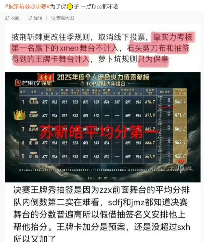 从粉丝们的反应上看,第四轮舞台公演的时候,节目组表示王牌卡给团队加分,结果总决赛的时候,直接给个人加分,正因如此,朱志鑫的分数直接超过苏新皓,所以引起较大的争议,也传出“萝卜岗”的言论。